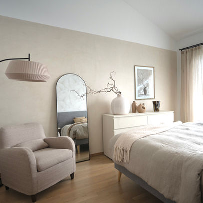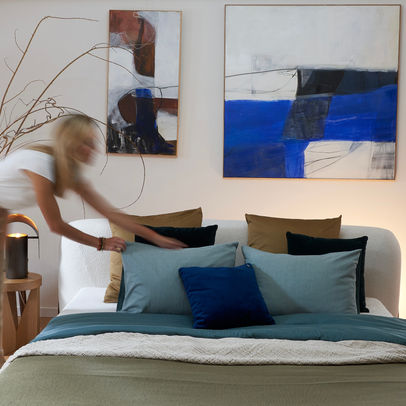 Cette chambre à coucher se décline dans des teintes chaudes et raffinées, sublimées par des textiles en soie, velours et lin. Ces mélanges créent une atmosphère douce avec une touche d'exotisme.